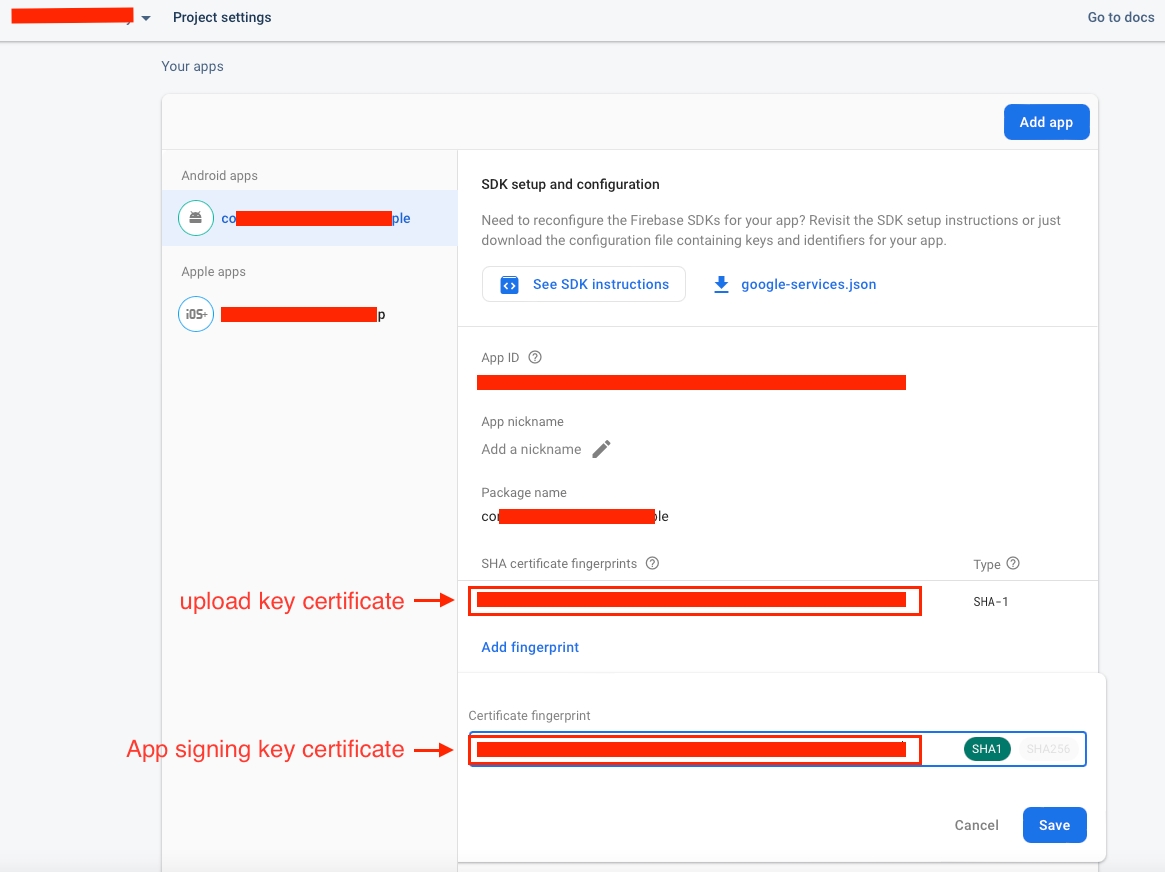Register the SHA-1 certificate thumbprint of each app signing key certificate and upload key certificate in Google Play Console App Settings > App Integrity tab in Firebase Console > Project settings > General tab.